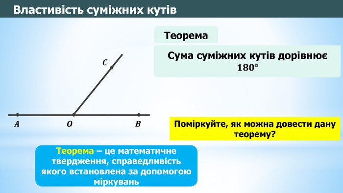 - Просто: Якщо два кути утворюють пряму, то вони суміжні.