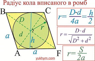 | Радіус кола | P/2, де P — півпериметр ромба |