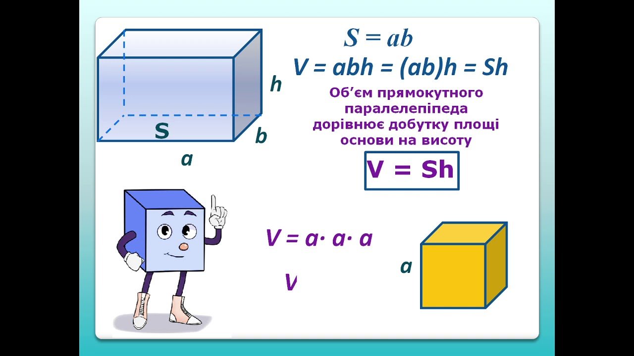 - Куб: Маєш сторону a? Об’єм дорівнює a³.