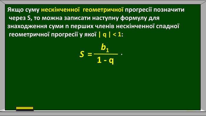 Де S — сума нескінченної геометричної прогресії. Все, що потрібно для обчислення — знати перший член і знаменник.